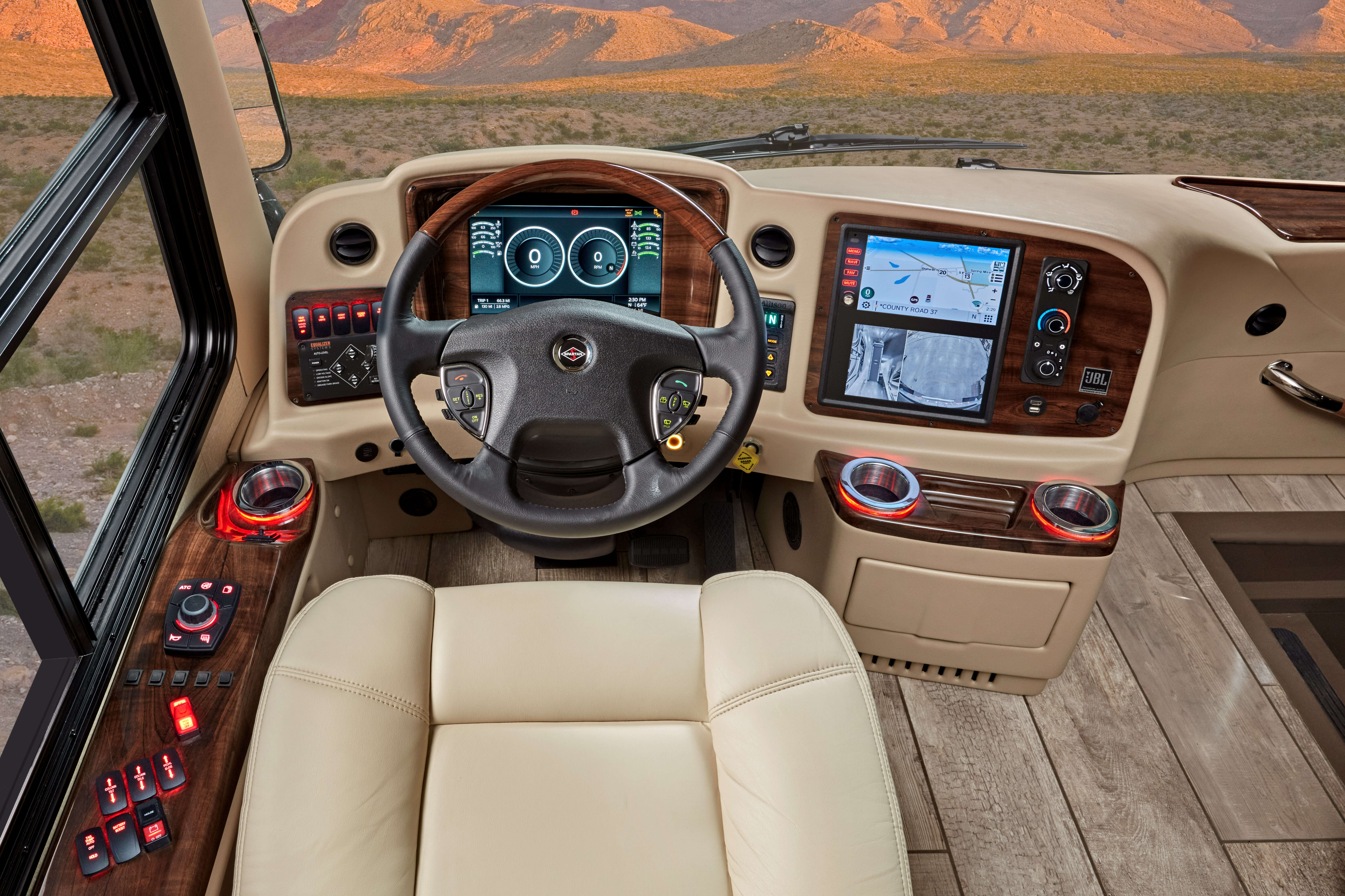 | Infotainment System(s) | Dual, glass panel 9” touchscreen in-dash infotainment center with Rand McNally™ RV navigation, Bluetooth, SiriusXM™, AM/FM tuner, integrated camera control, house mode whole coach audio distribution, and integrated VegaTouch coach control |