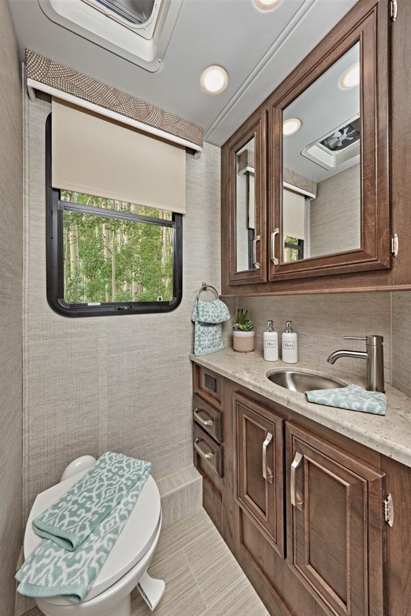 Our highest end Class C on a Ford® chassis, one of the first things you’ll notice about the Esteem is its fully custom-molded ABS surround in the cab-over area, featuring a panoramic window and power shade. Residential kitchens with abundant counterspace, recessed burners and an option for two A/Cs on a 30-amp coach are just a few of the characteristics that make the Esteem one of a kind.