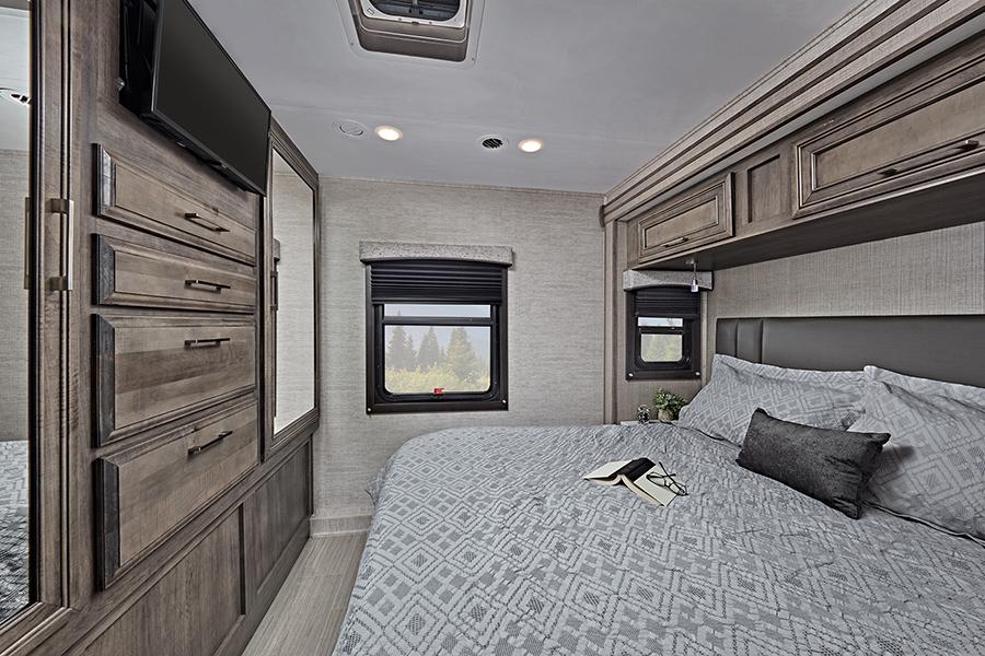 | Front/Rear Cap | One-piece, seamless, fiberglass front cap with automotive-bonded panoramic window and power shade |