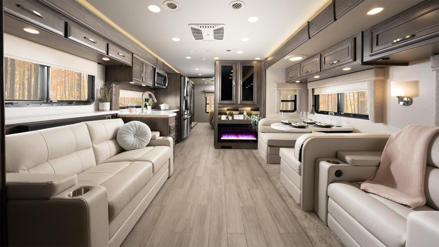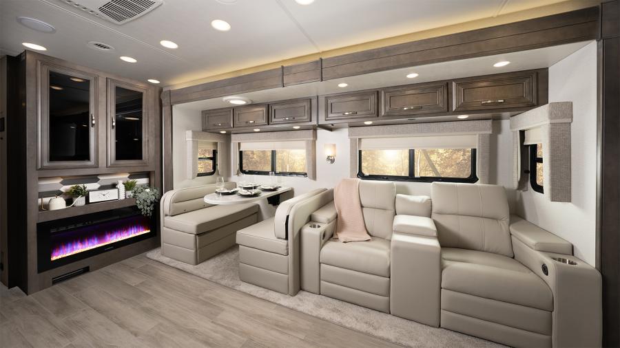 Inside, craftsmanship defines the experience. Hand-laid porcelain tile, solid hardwood cabinetry and stiles and premium fabrics create a sophisticated atmosphere, while the Aqua-Hot® heating system with electric floor heat keeps every corner cozy. With the Firefly total coach control system and app-based integration, managing lighting, climate, and more is as intuitive as it is effortless.