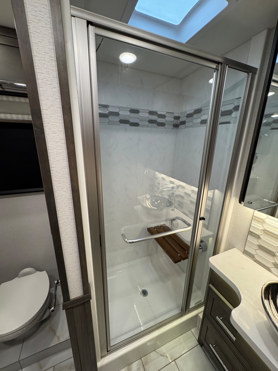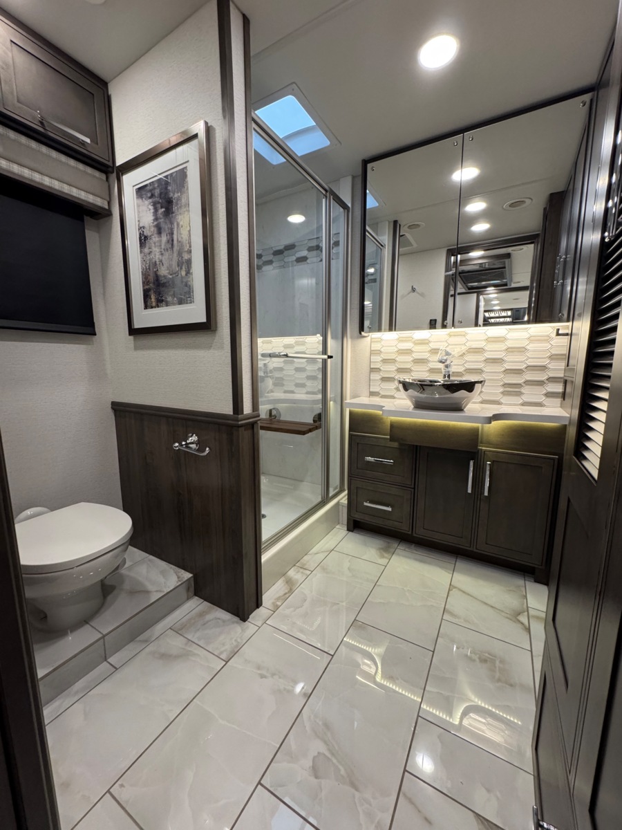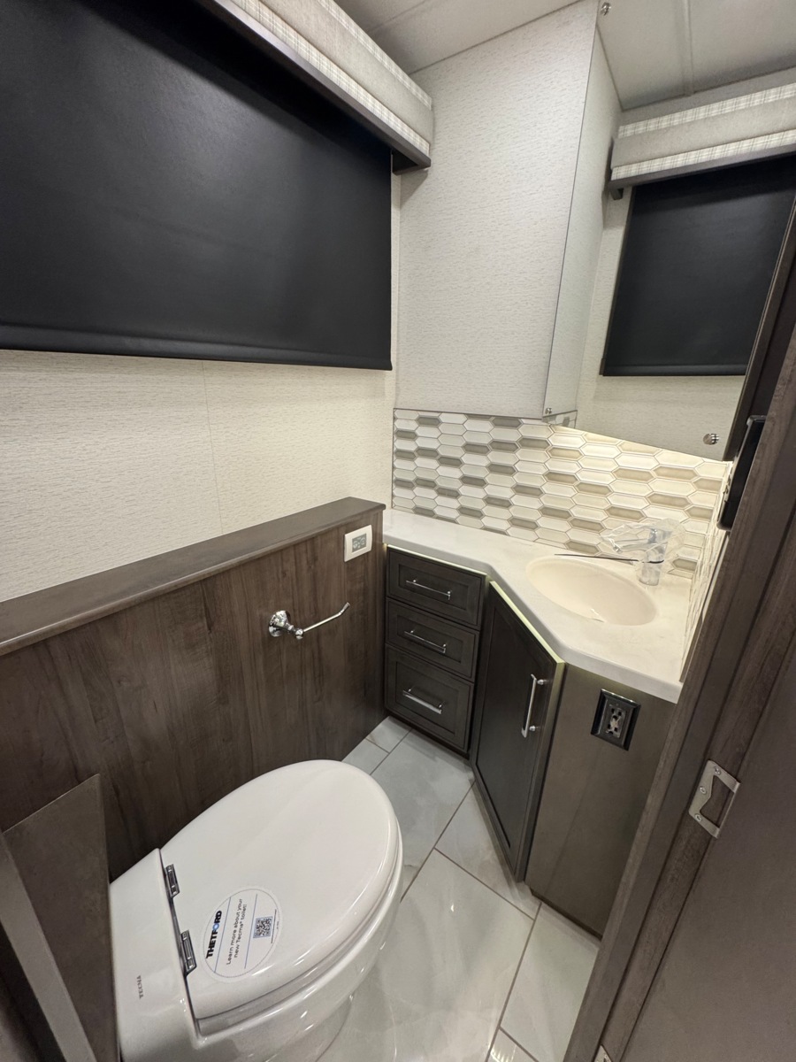 | Toilet | Thetford® Aria china toilet in main bath; Thetford® macerator toilet in mid bath |