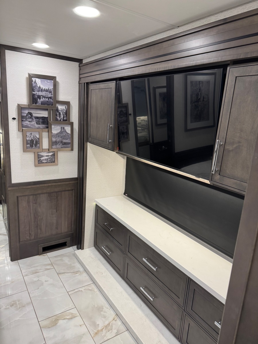 | Countertops | Solid-surface countertops and dimmable LED accent lighting |