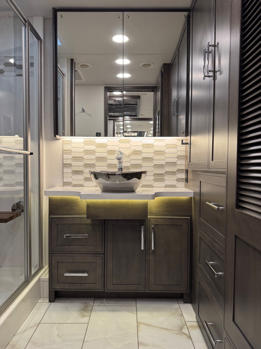 | Countertop(s) | Solid-surface countertops with single sink and dimmable LED accent lighting |