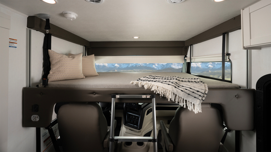 The optional overhead bunk in the Vision boasts a weight capacity of 750 lbs. This is 300 lbs. more than the industry standard and allows owners to sleep two full-sized adults or store extra gear while traveling.